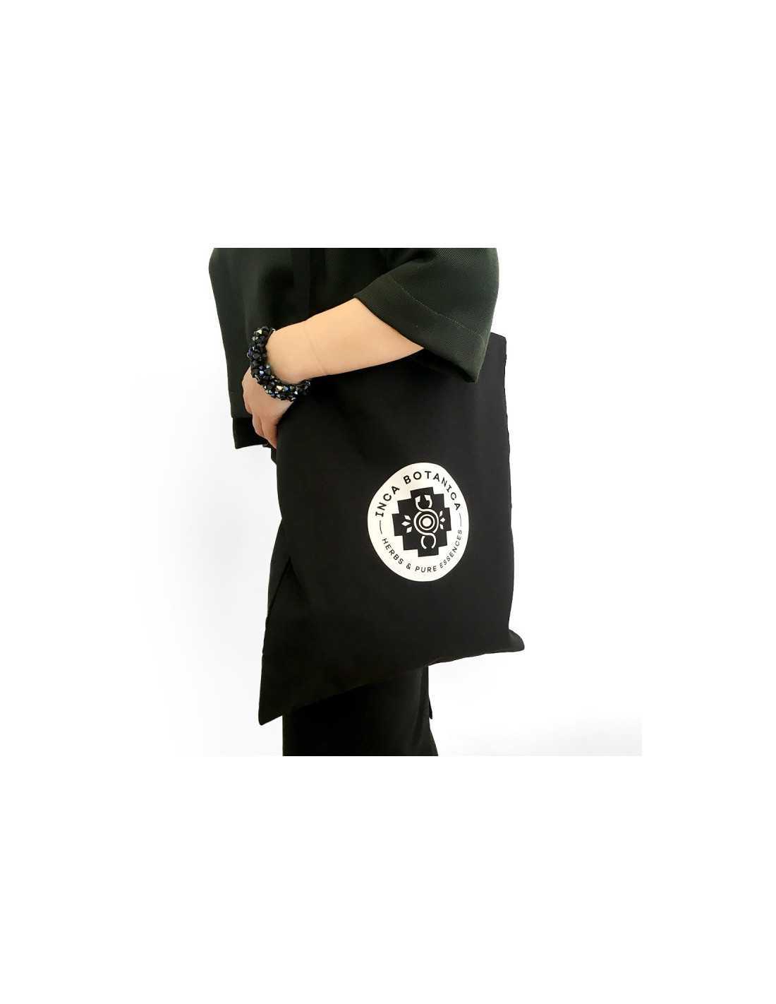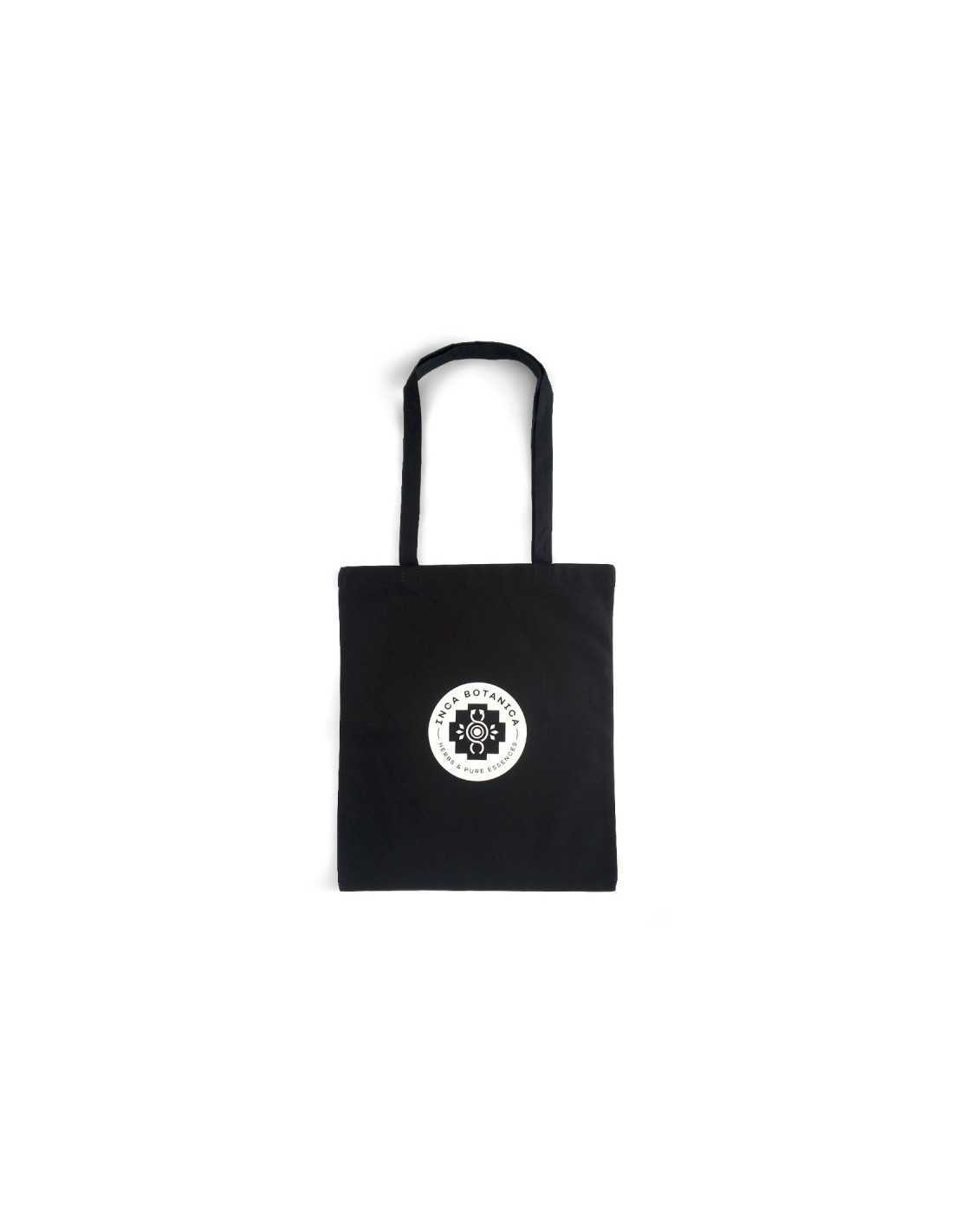 Black promotional cloth bag with long handles and Inca Botanica logo.