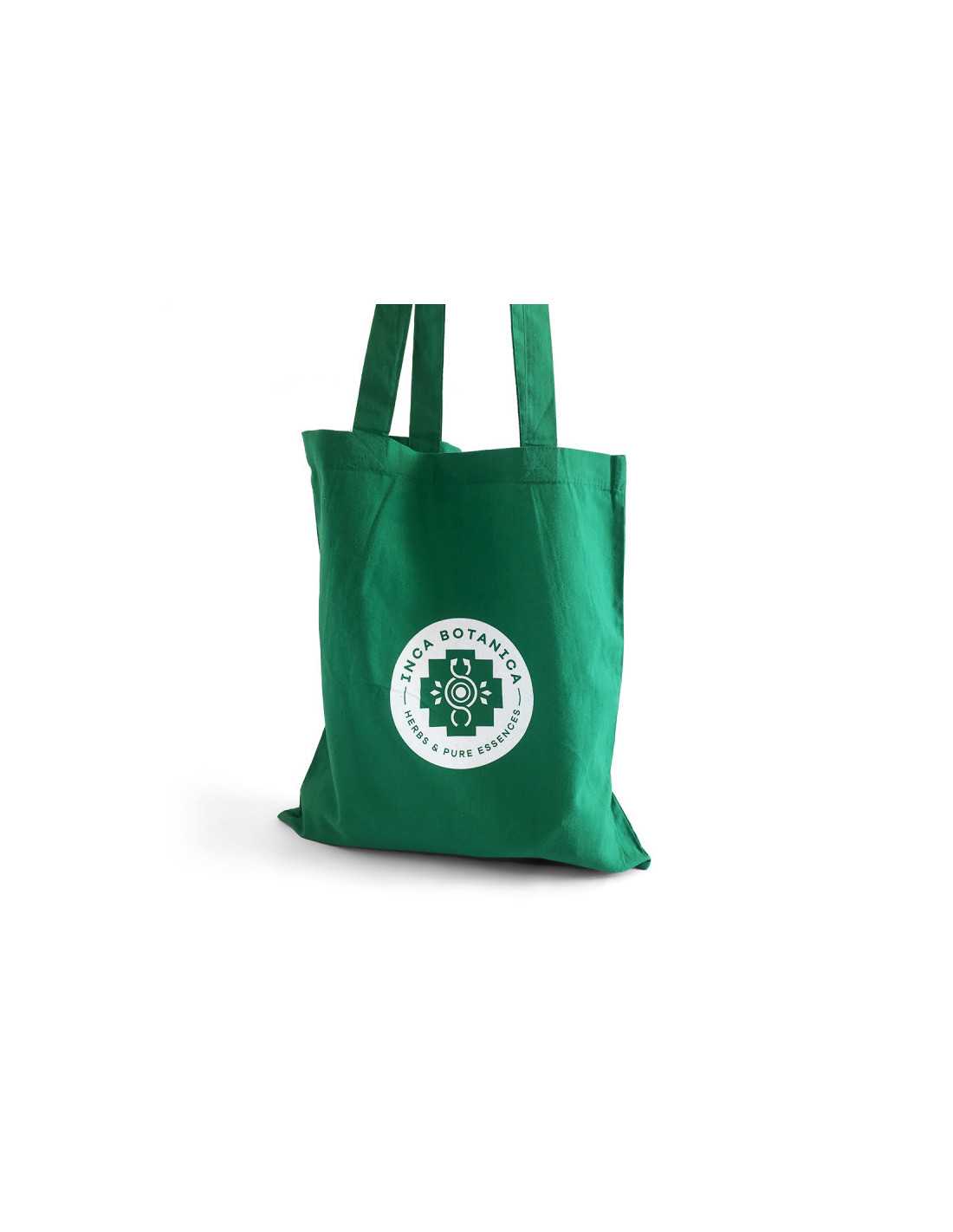 Green promotional cloth bag with long handles and Inca Botanica logo.